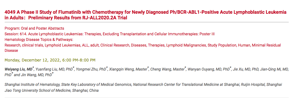 The 64th ASH (American Society of Hematology) Annual Meeting and Exposition is scheduled to take place in New Orleans, USA from December 10 to 13, 2022. The latest clinical trial results of Hansoh Xinfu (Flumatinib Mesylate Tablets), an innovative drug of Hansoh Pharma, will be presented in a Poster, oral form, representing a high degree of recognition by international authoritative experts of the efficacy and safety of flumatinib, a second-generation TKI developed independently in China, in primary ph+ALL.
